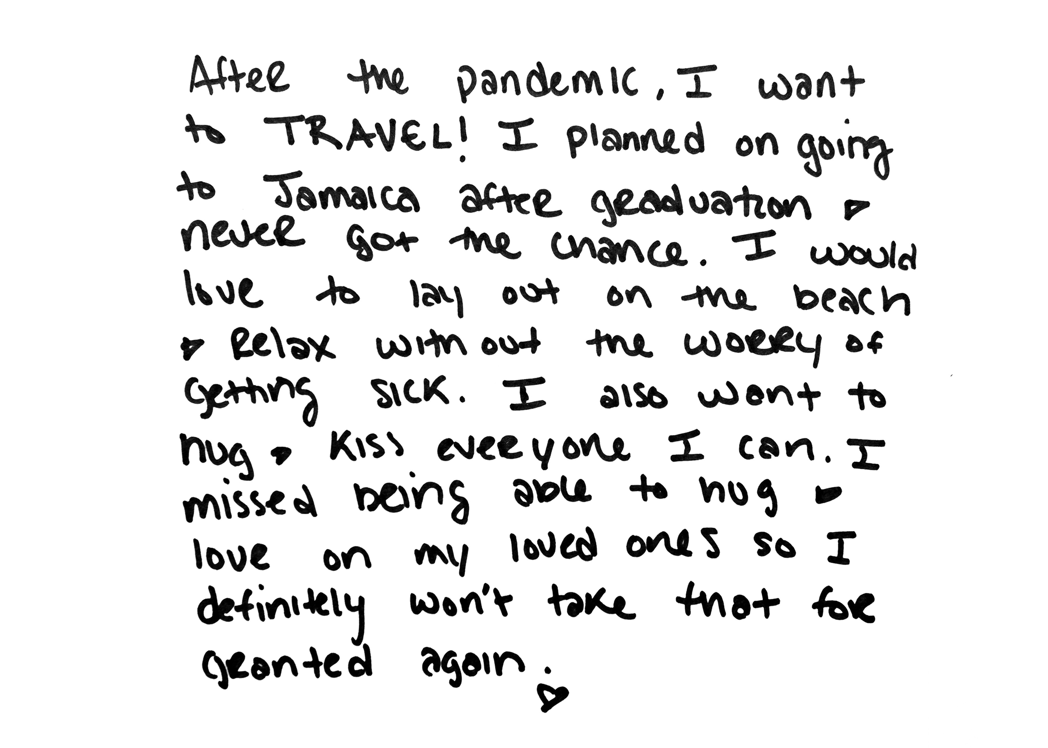 Following our interviews, we asked people to imagine what they want most in a future free of COVID. In their own handwriting, these are their words.